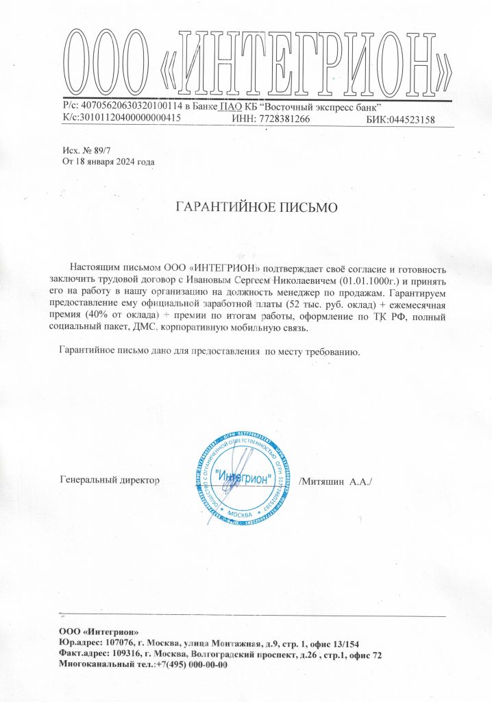 Гарантийное письмо для условно-досрочного освобождения (УДО)